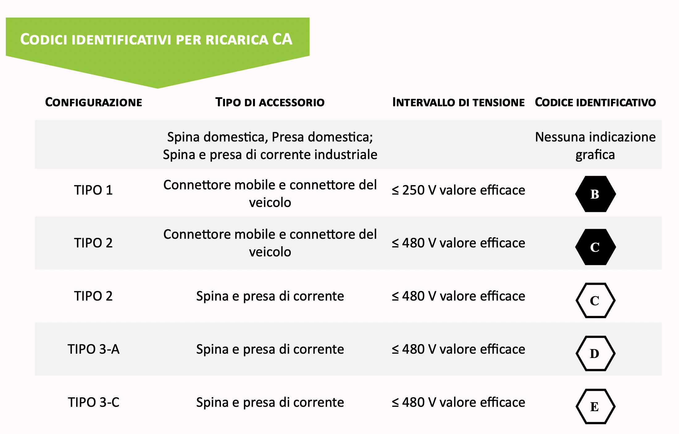 Regole precise anche per i colori: per il connettore e per la presa del veicolo si utilizza un simbolo bianco/argento su sfondo nero. Per la parte hardware del punto di ricarica (spina e presa di corrente), invece, simbolo nero su sfondo bianco/argento.