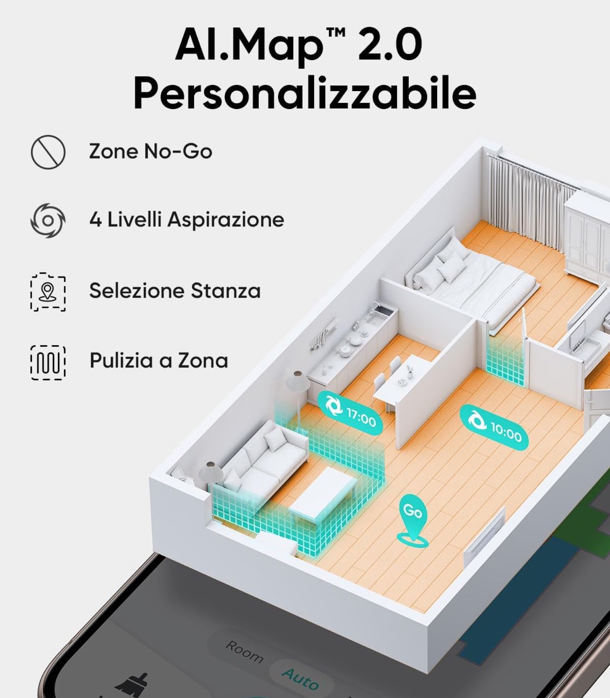Si muove attraverso il sistema di navigazione laser iPath che impiega la tecnologia Lidar per mappare la casa in modo da non lasciare spazi morti durante la pulizia e ottimizzare i percorsi per risparmiare tempo. Attraverso l’app AI.Map 2.0 è inoltre possibile personalizzare la pulizia ad esempio selezionando stanze specifiche da trattare, impostando zone vietate e sfruttando la mappatura multipiano per le case disposte su più livelli.
