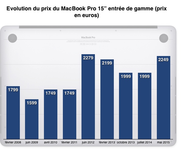Nel 2012, con la presentazione del primo MacBook Pro con display Retina, i costi hanno cominciato a lievitare, prezzo da pagare per le innovazioni: maggiore leggerezza, schermo con una densità di 227 pixel per pollice, archiviazione completamente flash e altri componenti più costosi rispetto ai tradizionali notebook visti fino allora. A giugno del 2012 si è arrivati a 2.279,00 euro per poi passare a 2.199,00 € (febbraio 2013) e 1.999 (ottobre 2013 e luglio 2014) e ora a 2.249,00 euro. Il prezzo attuale, come abbiamo già spiegato, è il risultato dell’euro indebolito rispetto al dollaro e contemporaneamente dell’aumento delle tasse d’importazione, due fattori che hanno costretto e costringeranno anche altri produttori a rialzare i prezzi.