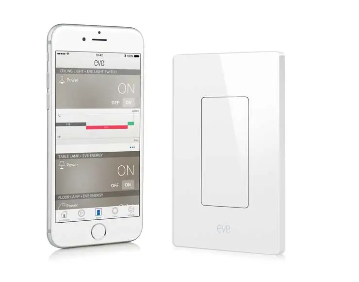 Eve Light Switch rimpiazza il pulsante di accensione a polo singolo e vanta tecnologia Bluetooth a basso consumo che consente un rapido setup, affidabilità ed efficienza energetica. È uno degli otto prodotti della linea Elgato Eve dedicata a HomeKit e negli USA è venduto a 49.95 dollari.
