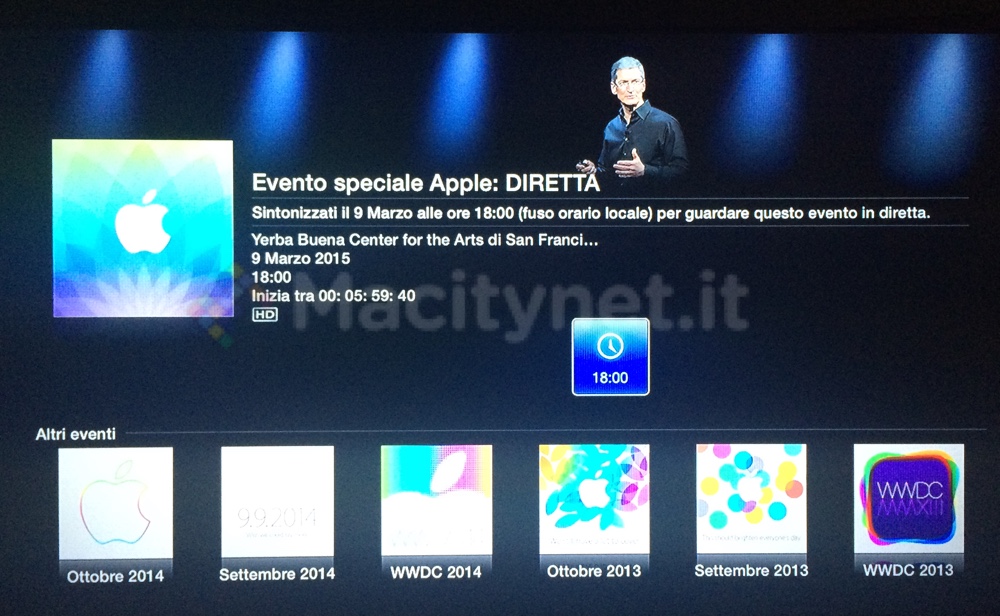 Questa sera l’evento Apple Spring Forward per la presentazione di Apple Watch inizierà alle ore 18 in Italia e non alle 19 come invece avviene tradizionalmente con i keynote di Apple. La conferma dell’orario arriva con la comparsa su Apple TV del canale dedicato alle presentazioni Apple: la diretta via streaming su Apple TV inizierà questa sera alle 18 orario italiano.