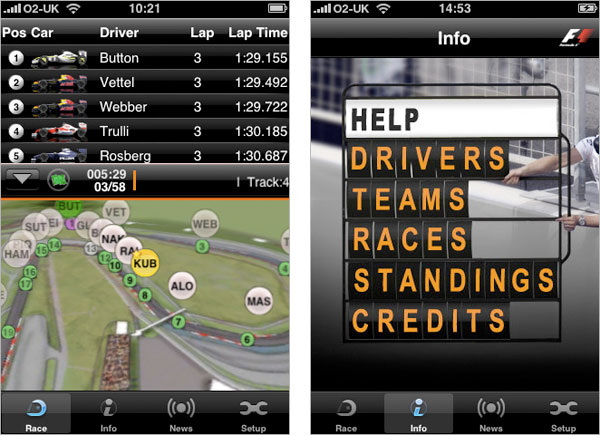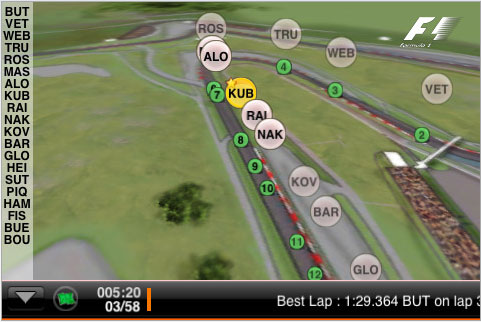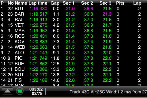 F1 Timing App è un programma ufficiale della Formula Uno che permette agli appassionati di seguire i gran premi non solo quando non si ha a portata di mano in televisore, ma anche utilizzando iPhone e touch come strumento integrativo in abbinata alla diretta televisiva. Grazie alle telemetrie rilevate direttamente sulla pista di gara e trasmesse in tempo reale il programma F1 Timing App visualizza sullo schermo del nostro tascabile multi-touch la posizione esatta delle automobili in tempo reale. Accelerazione e rallentamenti, sorpassi ed eventuali uscite di piste sono tutti visibili direttamente nello stesso momento in cui accadono in gara. Su di una mappa interattiva del tracciato l’utente può osservare l’andamento della corsa selezionando qualsiasi pilota o automobile. La visualizzazione grafica in tempo reale può essere ingrandita e ridotta, ruotata in modalità  ritratto o paesaggio, inoltre è accompagnata da una serie completa di informazioni relative ai tempi di percorrenza e ai distacchi tra i piloti. E’ sufficiente selezionare il pilota desiderato per avere subito a disposizione i dati calcolati relativamente a tutte le altre auto.