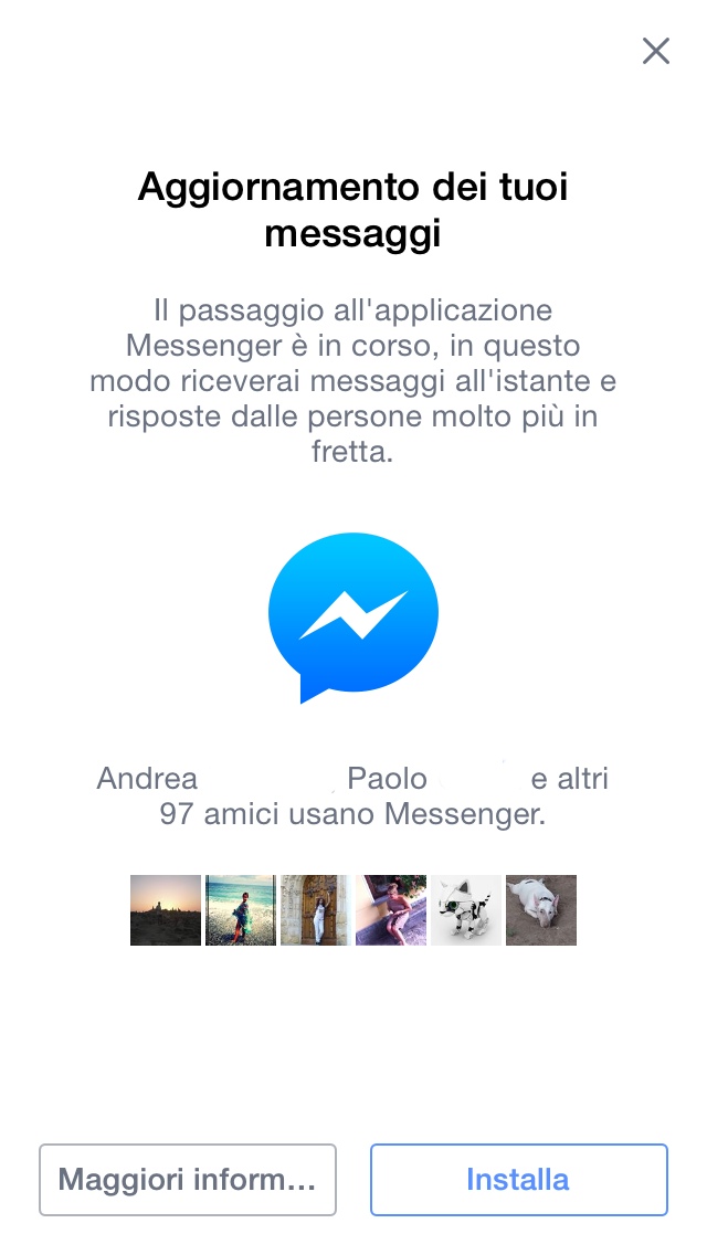 Facebook sta per rimuovere la funzione Messaggi all’interno dell’app Facebook per iPhone. Da alcune ore a questa parte gli utenti che aprono l’app Facebook per iPhone vengono avvisati che la funzione verrà presto rimossa dall’app principale e che, per continuare a inviare e ricevere messaggi e usare le funzioni di instant messaging occorre scaricare l’app Messenger per iOS di Facebook.