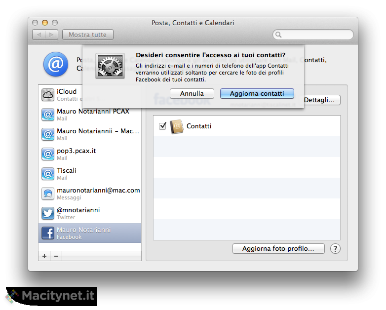 Non manca la possibilità di aggiungere la posizione e aggiungere ai Contatti la foto corrispondente al profilo dei nostri amici. Volendo, in Preferenze di Sistema è possibile disabilitare la sincronizzazione Contatti e non consentire a determinate applicazioni di accedere all’account Facebook. Un’avvertenza prima di concludere. Valutate bene se integrare Facebook nel sistema: vi ritroverete il calendario inondato di compleanni ed eventi e purtroppo al momento non è stato previsto un sistema per filtrare/limitare la visibilità di alcuni elementi. Speriamo che Apple risolva il problema con l’update a OS X 10.8.3.