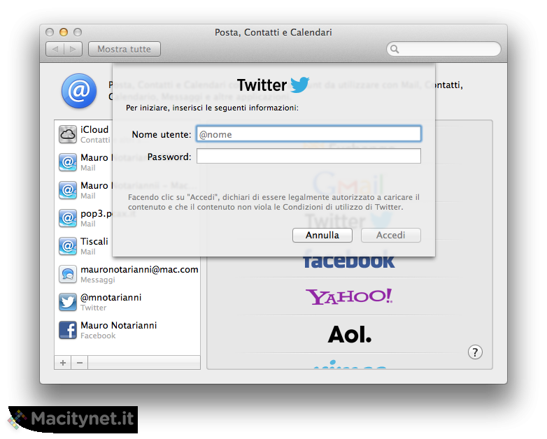 - Selezionando Facebook o Twitter (si può aggiungere prima l’uno e poi l’altro in modo indifferente) verrà richiesto nome utente e password del servizio.