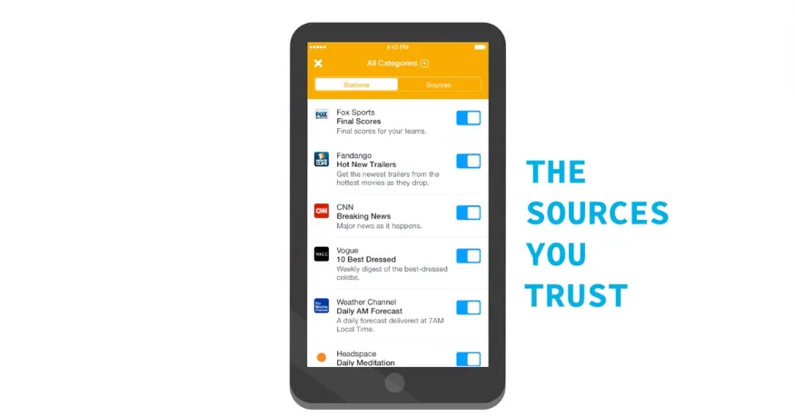 Fra queste possiamo ricordare ad esempio i risultati di un match sportivo, le previsioni del tempo per il giorno dopo, le notizie di attualità dell’ultima ora, l’andamento di un profilo azionario, le ultime foto pubblicat e su un sito o l’ultimo trailer cinematografico. Le fonti potranno essere scelte e personalizzate, in base all’elenco di partner, disponibile all’interno della app.