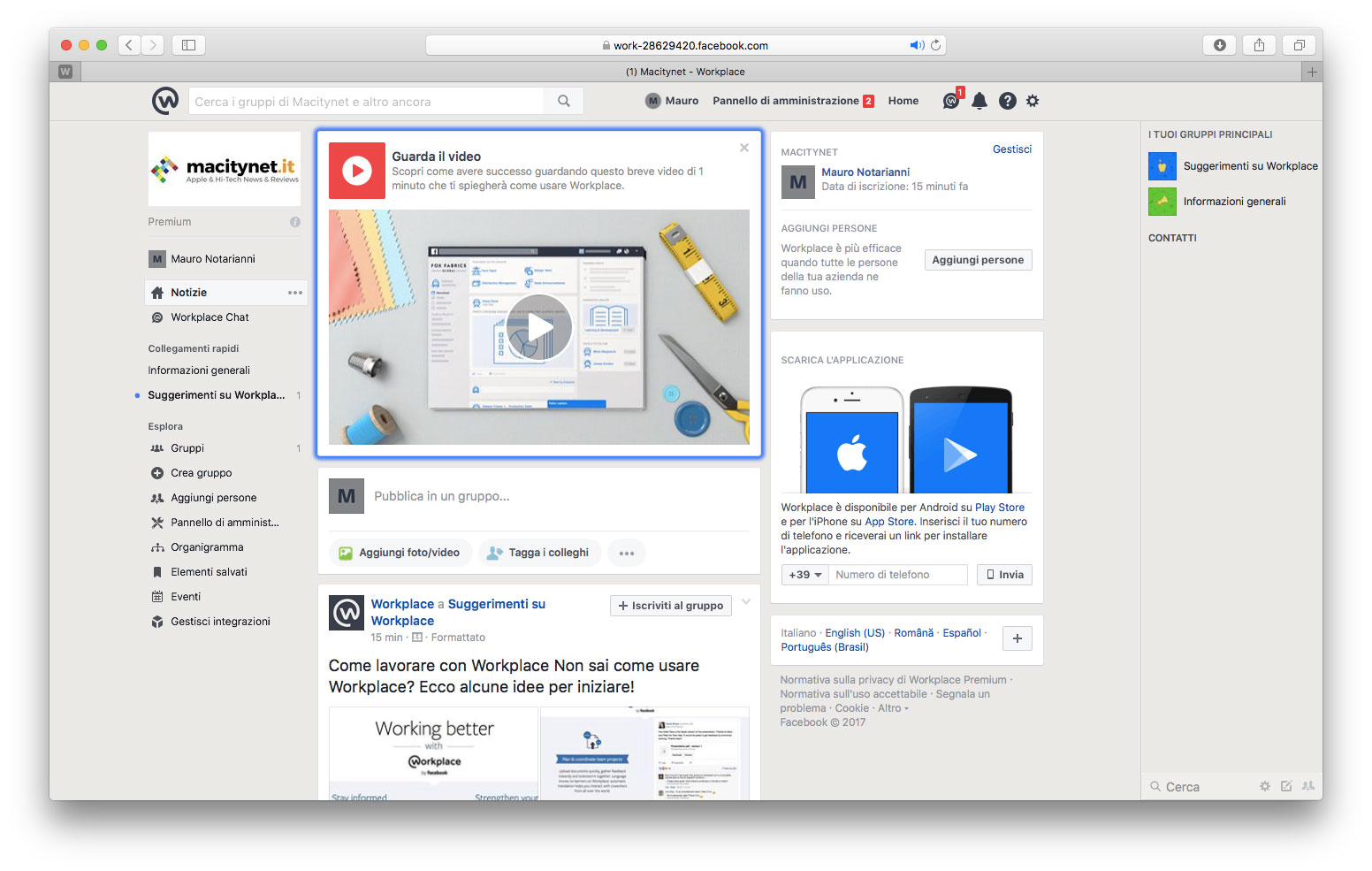 L’account Workplace, spiega Facebook, è un luogo in cui connettersi e collaborare con colleghi, iscriversi a gruppi inerenti il proprio team o ai propri progetti e ricevere notizie e aggiornamenti sull’azienda.