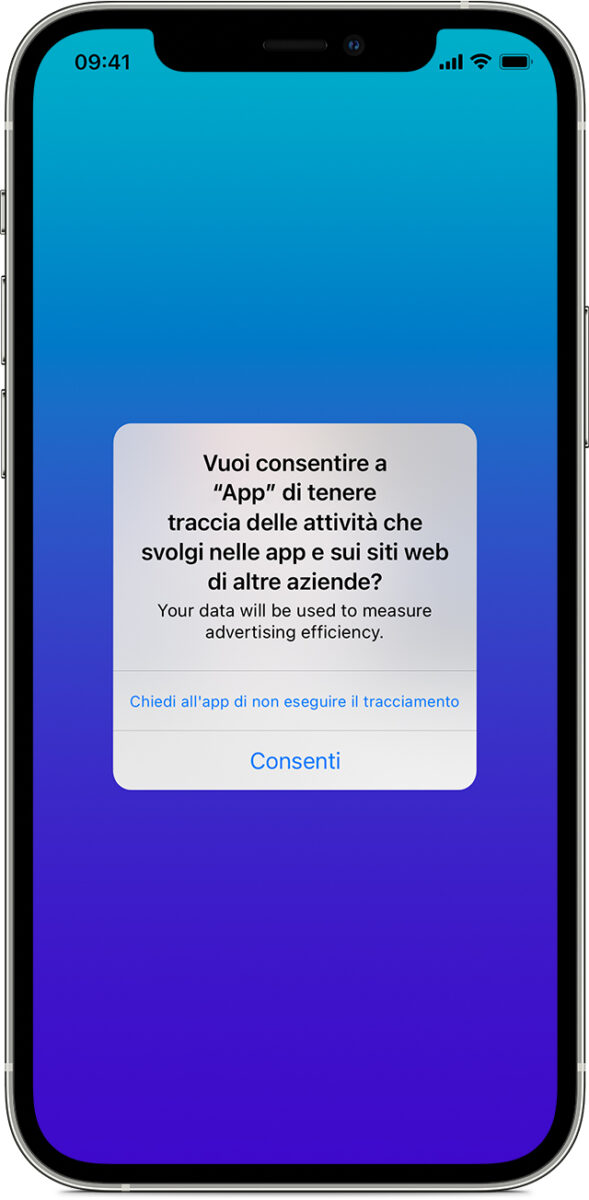 Apple obbliga gli sviluppatori di app a richiedere il tracciamento. L’utente può scegliere se farsi tracciare o meno; anche non accettando il tracciamento è possibile continuare a utilizzare tutte le funzionalità dell’app, indipendentemente dalla scelta di autorizzare o meno il tracciamento delle attività. Lo sviluppatore dell’app può personalizzare parte del messaggio per spiegare la ragione per cui l’app chiede di tracciare le tue attività.
