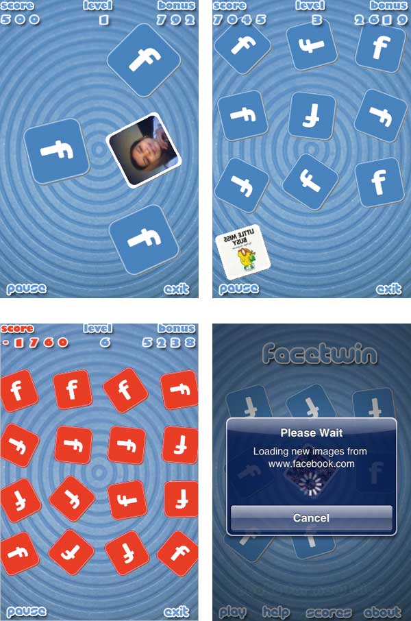 Invece di utilizzare un mazzo di carte ora il classico gioco di memoria può essere ancora più divertente e praticamente offrire partite infinite attingendo allo sterminato repertorio di immagini di Facebook. Invece delle carte coperte su di un tavolo sullo schermo di iPhone e touch sono visualizzate una serie di icone con spigoli arrotondati. Quando ne tocchiamo una con un tap del dito, l’icona ruota e mostra una immagine tratta da Facebook, solitamente un volto, una foto di gruppo con più persone ma anche mascotte, pupazzi e molto altro ancora.