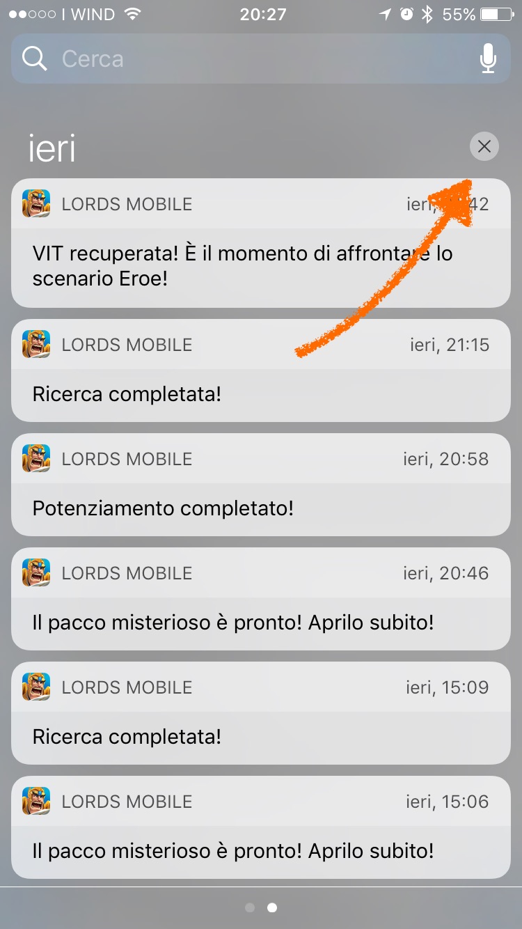 La prima cosa da fare, ovviamente, è richiamare il menu delle notifiche attraverso il consueto slide dall’alto verso il basso. In questa schermata, in cui vengono mostrate le notifiche recenti è necessario premere con una certa forze sulla “X” in alto a destra. Così facendo si avrà accesso alla funzione per cancellare tutte le notifiche tutte insieme, ma come facilmente intuibile si tratta di una funzione riservata soltanto ai possessori di iPhone 6s, o successivo, dispositivo che ha 3d touch.