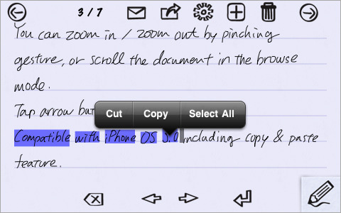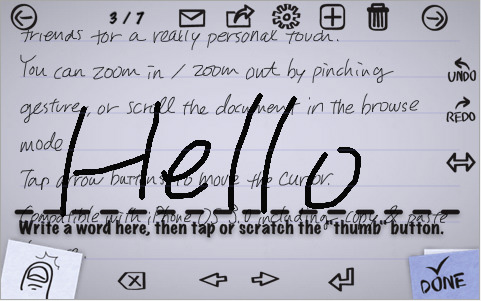 Nella schermata principale del software pulsanti e controlli si trovano vicino ai bordi dello schermo, mentre la parte principale rimane sgombra per permettere la scrittura manuale con il dito sul pannello LCD. Man mano che tracciamo segni e lettere queste vanno a inserirsi nel nostro documento una volta che la parola è completa, premendo un pulsante oppure in modo completamente automatico, impostando un tempo di ritardo dal momento in cui il dito si stacca dallo schermo. Il risultato finale ha l’aspetto di una vera e propria lettera scritta a mano con la penna, stesso discorso per elenchi, note, appunti, lista della spesa e qualsiasi altra cosa desidereremo scrivere. Con l’attuale versione 1.4 è possibile scegliere penne con punte di tre dimensioni diverse e impostare il colore tra nero, rosso, blu e verde. E’ disponibile su App Store a 79 centesimi.