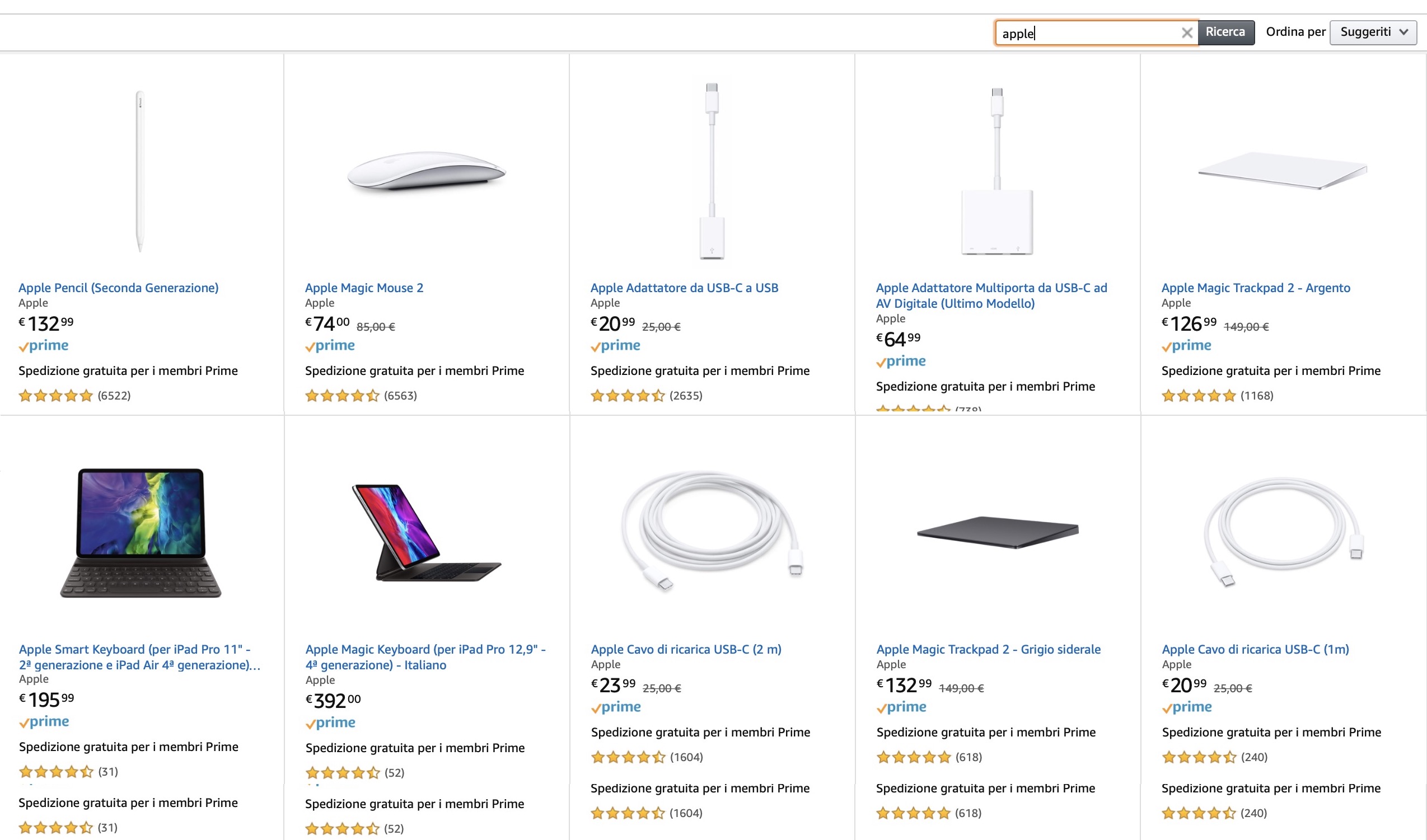 Vi abbiamo già segnalato l’offerta di Amazon di 50 Euro di sconto sull’aquisto cumulativo di 500 euro di prodotti valida fino ad oggi 10 Dicembre 2020. Qui vogliamo rimarcare che tra i tanti prodotti che fanno parte di questa iniziativa ce ne sono tanti a marchio Apple come Alimentatori, cavi, trackpad che è difficile se non impossibile trovare normalmente in offerta.