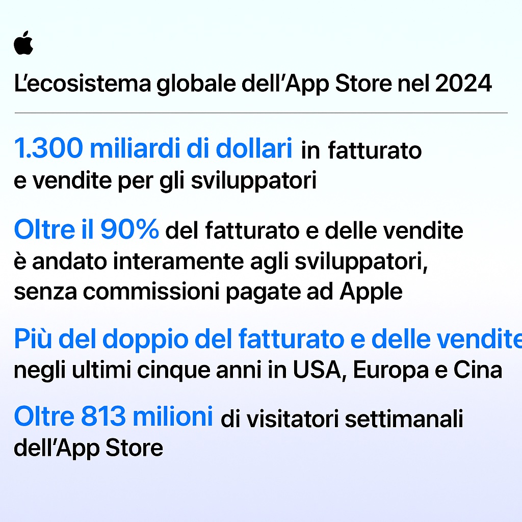 Basandosi su una metodologia simile a quella già vista nel report americano, Apple snocciola cifre: in particolare, stima i ricavi facilitati dall’App Store nel 2024 a 1.300 miliardi di dollari.