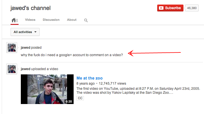 Due in particolare gli interventi più interessanti. Il primo è quello di Karim Jawed, nome poco noto alla cronache mondane del panorama tecnologico ma non per questo non importante: Jawed non è altro che uno dei co-fondatori di YouTube e al suo account appartiene il primo video mai postato su YouTube, Me at the Zoo. Dopo quel video l’account di Jawed è rimasto silente per 8 anni, fino a ieri, quando è apparso il seguente commento: