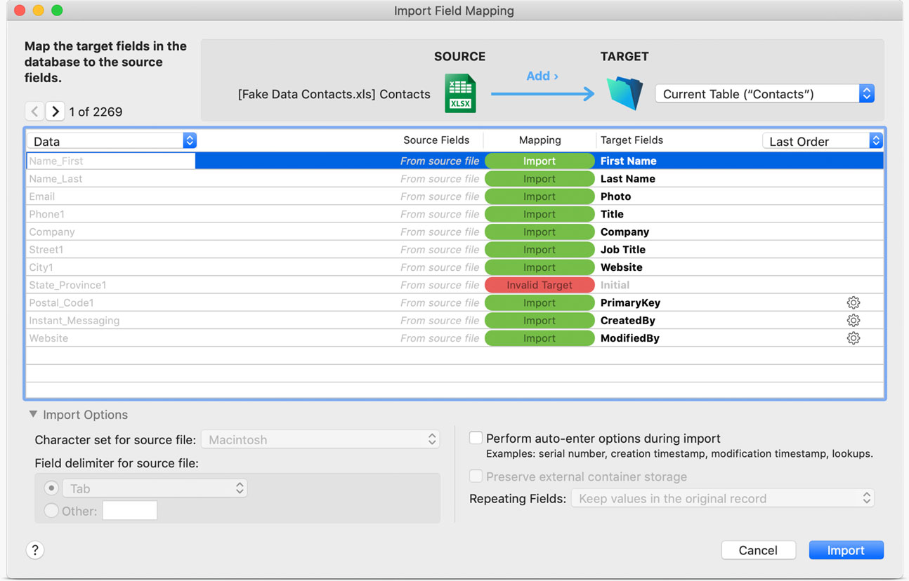 - Nuova interfaccia utente per l’importazione dei dati: possibilità di associare più facilmente i dati di origine importati ai campi utilizzando la nuova finestra di dialogo Specifica l’ordine di importazione. È possibile usare la funzione type-ahead invece del drag & drop per una maggiore efficienza e specificare delimitatori personalizzati quando si importano determinati tipi di file.