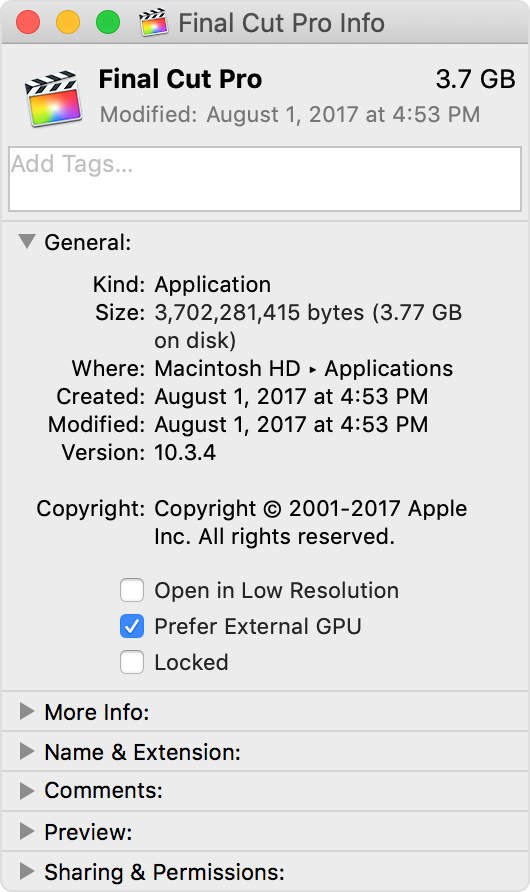 Chi sfrutta una eGPU può migliorare le performance di Final Cut Pro X selezionando dal Finder l’icona dell’applicazione. Facendo click sull’icona e premendo i tasti cmd-i (oppure selezionando dal menu “FIle” del Finder la voce “Ottieni informzioni”), è possibile attivare l’opzione “Prefer external GPU” e riavviare Final Cut.