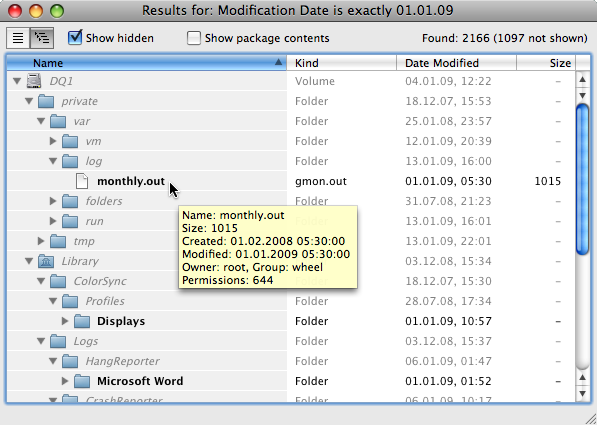 I risultati della ricerca sono visualizzati in una finestra di tipo gerarchico. Si può cambiare modalità di visualizzazione premendo Command-1 (lista) o Command-2 (ad albero) o facendo click sulle due icone presenti in alto nella finestra principale del programma. Le ricerche possono essere salvate: vengono memorizzate in file con estensione “.faf”, per poi essere richiamate con un doppio click dal Finder. L’ultima versione supporta OS X 10.11 El Capitan e risolve alcuni bug minorier. Il programma è chiaramente ispirato al vecchio Finder del Mac OS classico, è di piccole dimensioni (7.7MB), partico, comodo e funzionale.