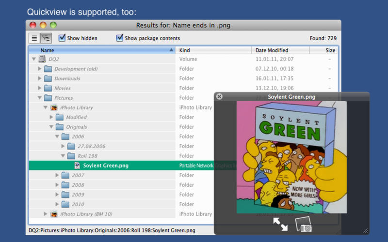 I risultati della ricerca sono visualizzati in una finestra di tipo gerarchico. Si può cambiare modalità di visualizzazione premendo Command-1 (lista) o Command-2 (ad albero) o facendo click sulle due icone presenti in alto nella finestra principale del programma. Le ricerche possono essere salvate: vengono memorizzate in file con estensione “.faf”, per poi essere richiamate con un doppio click dal Finder. L’ultima versione supporta OS X 10.9 Mavericks e i tag del Finder. Il programma è chiaramente ispirato al vecchio Finder del Mac OS classico è di piccole dimensioni e funzionale.