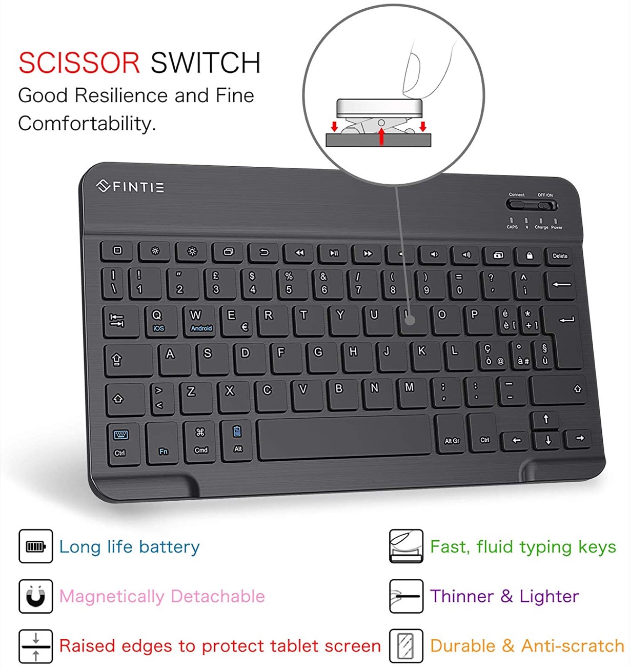 La tastiera usa tasti meccanici e come dicevamo si collega all’iPad senza fili: monta una batteria a lunga durata e può essere facilmente rimossa dalla custodia perché vi si aggancia magneticamente, quindi se si sta andando a scuola o a lavoro e si è certi di non doverla usare basta sfilarla e lasciarla a casa per allegerire il tablet; viceversa se la tastiera serve, basta avvicinarla alla superficie per agganciarla.