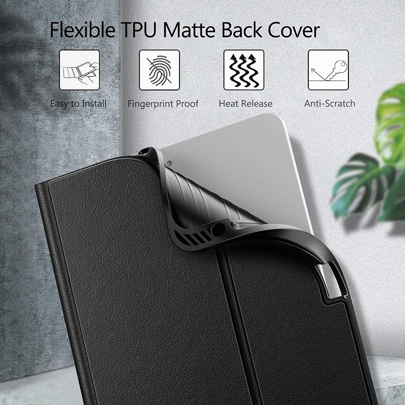 La custodia aderisce ai bordi e protegge il dispositivo in ogni sua parte, non solo il dorso e il display con la copertina, ma anche le cornici, lasciando comunque le dovute aperture per permettere all’utente di schiacciare i pulsanti, usare le fotocamere, collegare cavi e accessori e ascoltare al massimo della potenza l’audio che viene riprodotto attraverso gli altoparlanti. Consente di mantenere sollevato il tablet a tre diverse inclinazioni ed è realizzata in gomma TPU, sufficientemente flessibile per poter calzare senza sforzo ma allo stesso tempo con un materiale capace di proteggere efficacemente il tablet da urti, polvere e graffi.