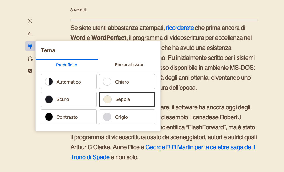 Nella modalità lettura è possibile richiamare anche l’opzione “Tema” e scegliere, appunto tra temi-colore come “Scuro”, “Contrasto”, “Chiaro”, “Seppia”, “Grigio” o personalizzare a piacere testo, sfondo, link visitati e non visitati, ecc.