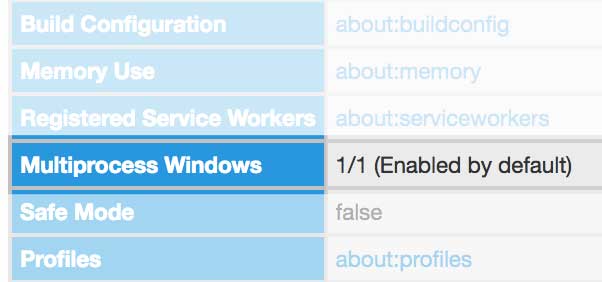 In pratica se una pagina occupa una quantità eccessiva di risorse sul computer, le schede, i pulsanti e i menu continueranno a funzionare. Dopo aver aggiornato il programma (basta andare nel menu “Firefox” e scegliere “Informazioni su Firefox” o scaricare il pacchetto completo da questo indirizzo), potete verificare il supporto all’e10s digitando “about:support” (senza virgolette) nella barra degli indirizzi. Se e10s è attivo, vedremo l’indicazione “1/1” (Attivato per impostazione predefinita) nella sezione “Finestre multiprocesso”.