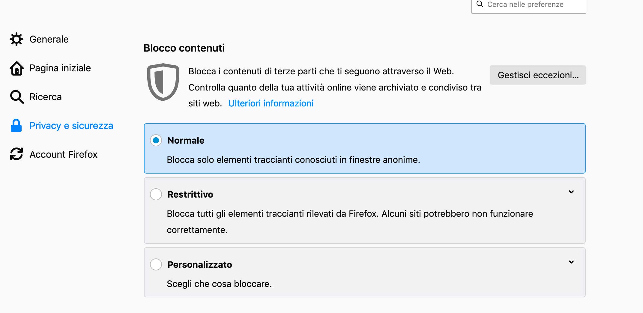 Tre le possibili modalità di blocco contenuti: Normale (blocca solo elementi traccianti conosciuti in finestre anonime), Restrittivo (blocca tutti gli elementi traccianti rilevati da Firefox ma alcuni siti potrebbero non funzionare correttamente), Personalizzato (l’utente può decidere cosa bloccare).