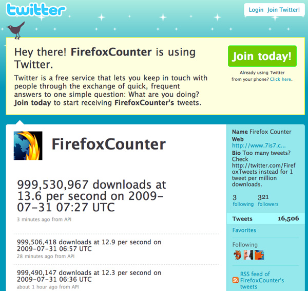Oltre ai post Twitter il conto alla rovescia per il record di Firefox può essere seguito da questa pagina Web. Ricordiamo che il totale dei download include tutte le versioni di Firefox rilasciate dal 2004 a oggi, inclusi gli aggiornamenti effettuati manualmente dagli utenti, non sono invece inclusi nel calcolo gli aggiornamenti effettuati automaticamente dal programma.