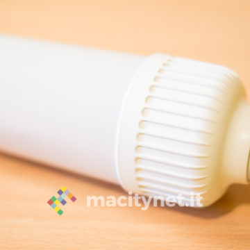 Si tratta di una lampada dalle dimensioni simili a quelle di una lampadina fluorescente: la parte luminosa è lunga 11.5 centimetri mentre considerando anche l’attacco E27 per avvitarla al portalampada è lunga complessivamente 18.5 centimetri (diametro 5.5 centimetri circa). E’ realizzata interamente in plastica bianca, semi-opaca nella parte luminosa, e con l’attacco E27 ovviamente in metallo.
