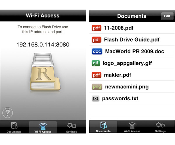 La funzione principale del programma Flash Drive è tanto semplice quanto pratica: trasforma i tascabili touch della Mela in una sorta di super chiavetta di memoria. Con il programma in funzione è possibile collegare iPhone e touch a qualsiasi computer Mac o Windows per utilizzare il tascabile per scrivere e leggere file, proprio come faremmo con una tradizionale chiave di memoria USB. Il punto però sta nel fatto che il collegamento non avviene tramite la porta USB, come il nome del programma e anche la descrizione su App Store lasciano intendere.