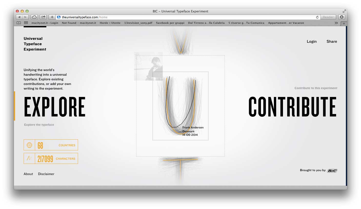 Bic, l’azienda nota – tra le altre cose – per le classiche penne a sfera, ha chiesto a un’agenzia pubblicitaria tedesca l’avvio dell’Universal Typeface Experiment, progetto in crowdsourcing che si prefigge di catalogare migliaia di caratteri dell’alfabeto latino scritti a mano da chiunque sia disposto a disegnarli. Il risultato sarà alla fine un font scaricabile che rappresenta la scrittura media di chi ha partecipato. È possibile inviare la propria scrittura portandosi prima sul sito dedicato e poi dallo smartphone o tablet a un sito al quale è possibile accedere indicando un codice fornito durante la visita al primo. Le lettere disegnate sul display di smartphone o tablet sono visualizzate in tempo reale sullo schermo del computer. Al termine è possibile indicare il proprio account Facebook (si può anche proseguire in modo anonimo) e dati concernenti l’età, sesso, professione, ecc.