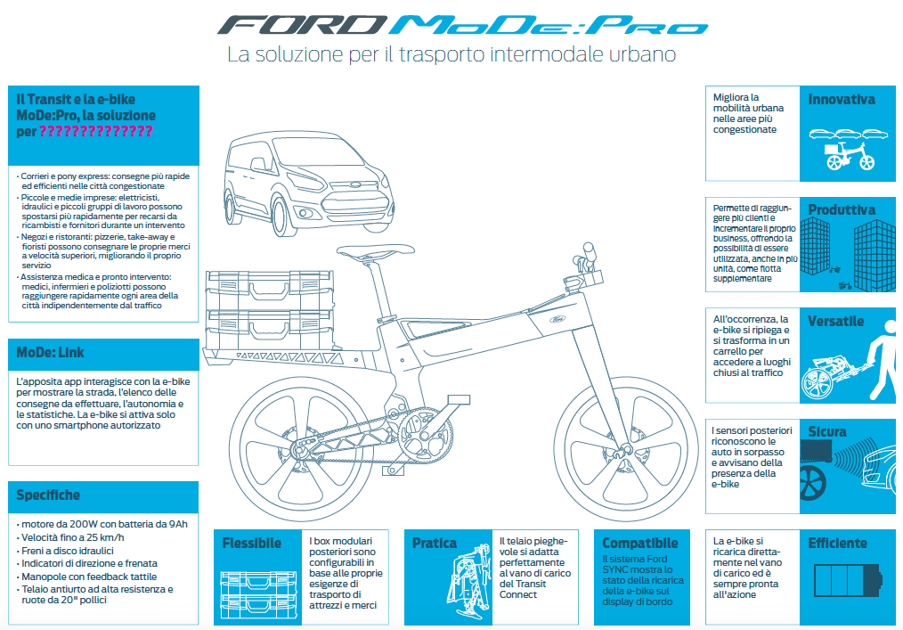 Il progetto è nato con una sfida globale lanciata da Ford ai propri dipendenti in tutto il mondo, chiamati a proporre la propria idea di e-bike. Tra le 100 migliori proposte, Ford ha realizzato e presentato al Mobile World Congress le 2 risultate più adatte all’utilizzo privato e commerciale, la MoDe:Me e la MoDe:Pro, entrambe dotate di un motore da 200 watt e di una batteria da 9Ah con pedalata assistita fino a una velocità di 25 km/h.