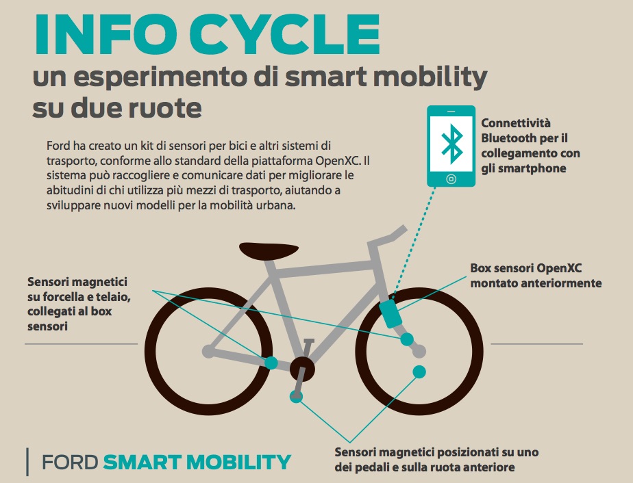 Al Mobile World Congress, Ford ha presentato anche il programma Info Cycle, un’iniziativa di raccolta dati basata sul protocollo open-source OpenXC grazie alla quale ogni bicicletta può trasformarsi in un centro di raccolta dei dati sul traffico e sulla circolazione urbana, allo scopo di perfezionare in tempo reale i modelli ideali di guida in città