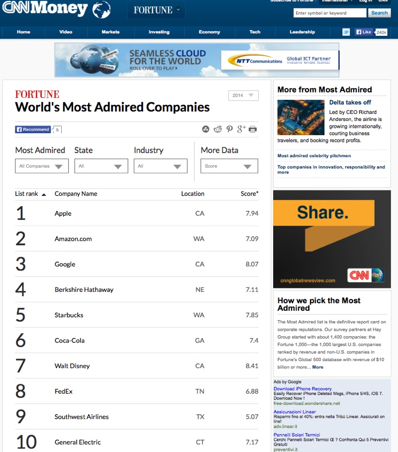 La classifica è stata compilata prendendo in esame le più grandi società statunitensi Fortune 1000 anche quelle internazionali nella graduatoria Fortune Global 500: tra quelle selezionate gli intervistati, oltre 3.900 tra manager, dirigenti e analisti hanno scelto quelle a loro giudizio più ammirate. L’ammirazione per ogni società è stata valutata in 9 campi diversi che vanno dal valore degli investimenti alla responsabilità sociale: Apple è risultata prima in sette settori su nove.