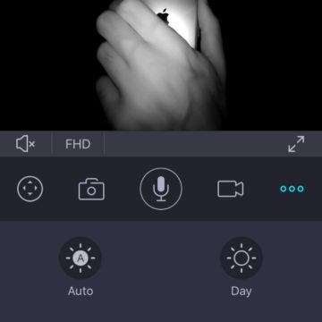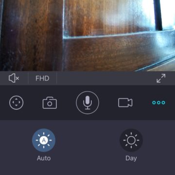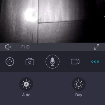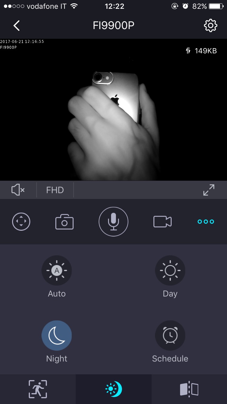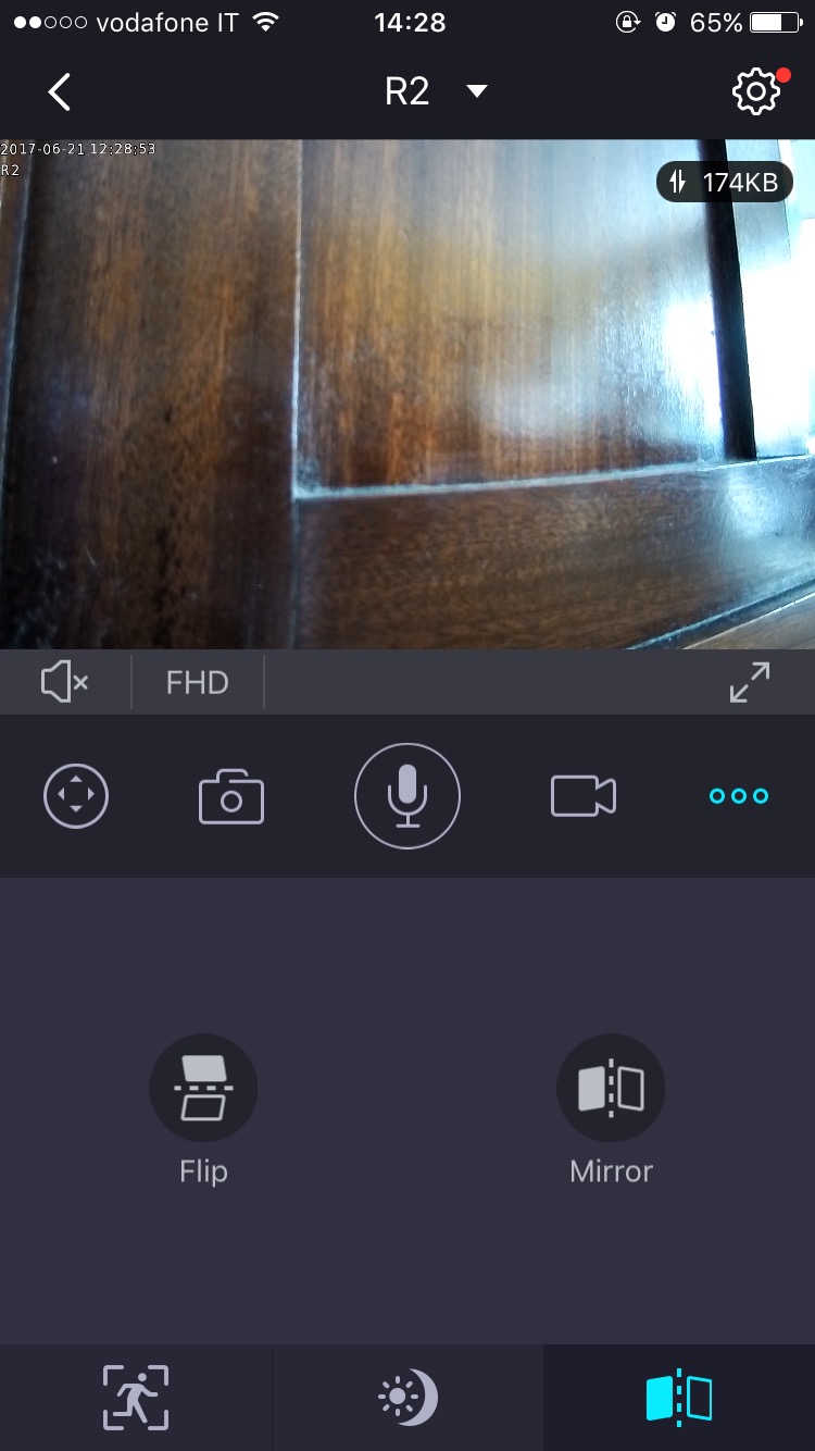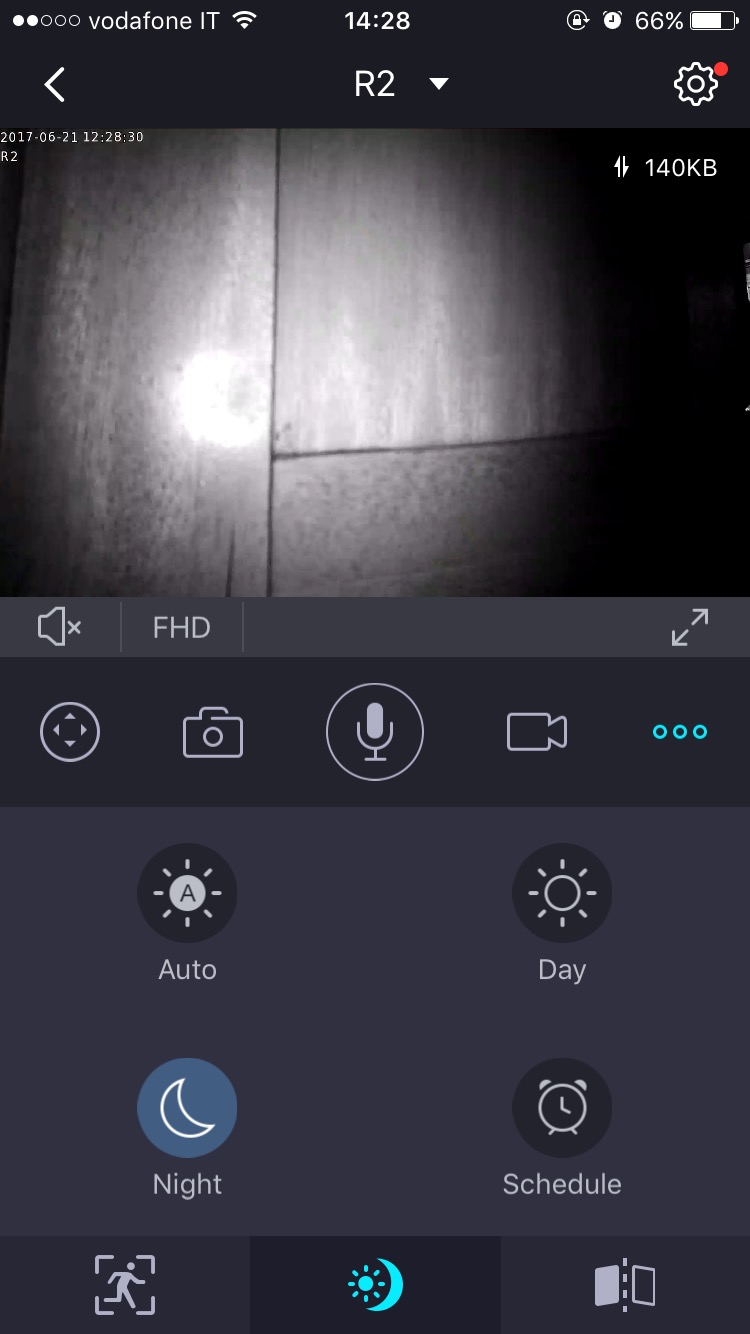 Il simbolo Fotocamera scatta una foto, quello Video avvia la registrazione di un filmato e il simbolo Microfono permette di attivare il microfono dello smartphone per parlare con chi si trova di fronte alla telecamera sfruttando l’altoparlante incorporato (solo R2). L’ultimo pulsante, contrassegnato da tre puntini, permette di accedere a tre ulteriori schermate. Una offre l’accesso al sistema di attivazione/disattivazione del riconoscimento dei movimenti, la seconda permette di attivare manualmente la modalità giorno e notte o programmarne l’attivazione di una e dell’altra in base a specifici orari, la terza permette di capovolgere la ripresa nel caso in cui si dovesse posizionare la telecamera a testa in giù.