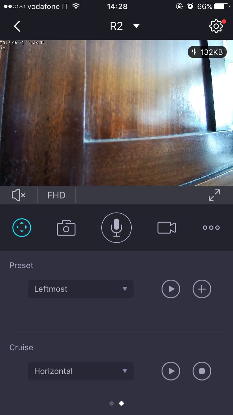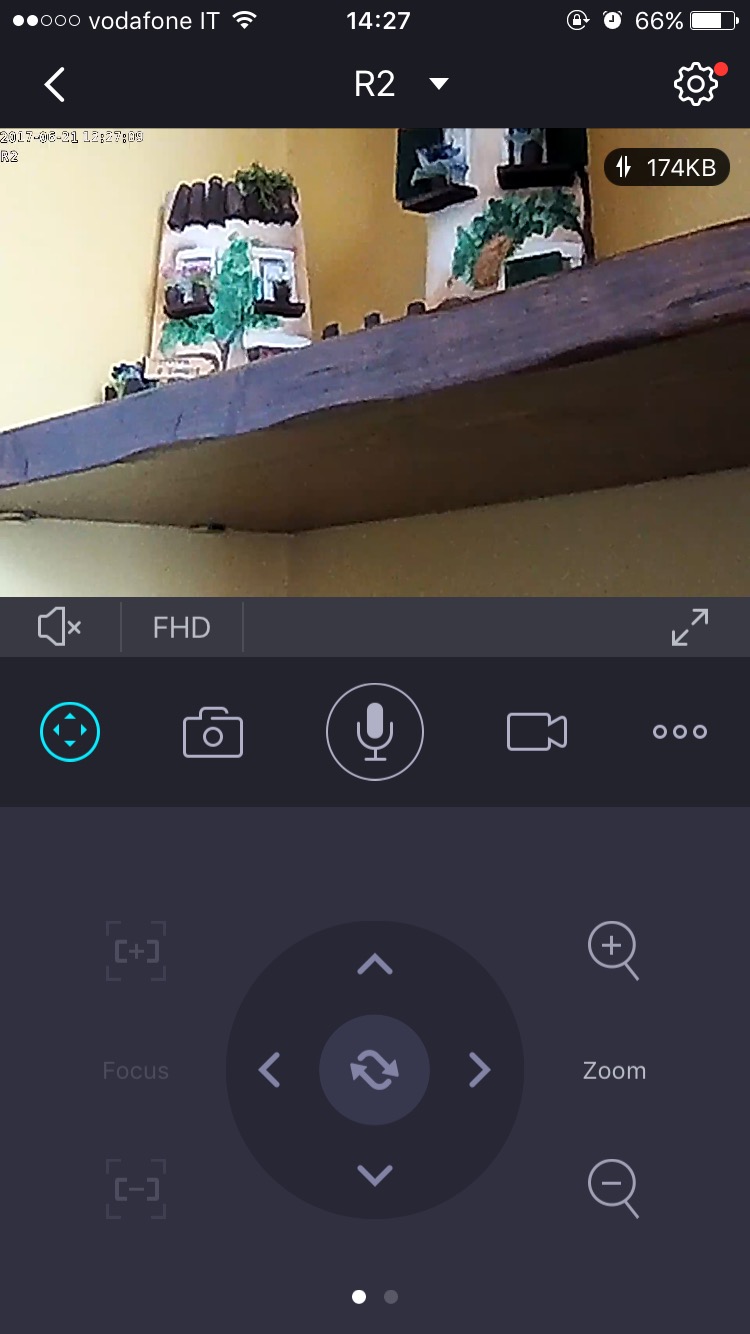 Selezionando l’anteprima di una telecamera si accede alla relativa schermata di controllo. Cinque pulsanti separano le cinque principali funzioni disponibili. Il primo, contrassegnato da alcune frecce direzionali, permette per l’appunto di muovere la telecamera in tutte le direzioni (solo R2), effettuare uno Zoom IN e OUT e regolare la messa a fuoco. Per quanto riguarda la videocamera R2, l’unica delle due capace di spostare l’inquadratura, è anche possibile attivare dei preset per alcuni movimenti automatizzati: con un click la videocamera comincerà a guardarsi intorno con movimenti ciclici, offrendo una panoramica completa dell’intera stanza nella quale è stata posizionata.