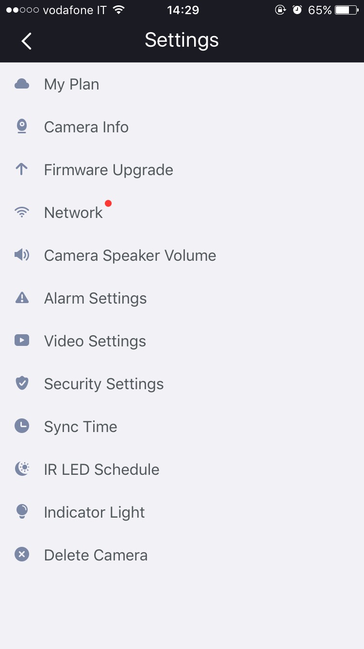 L’ingranaggio permette infine di accedere alle impostazioni della telecamera selezionata. Da qui è possibile leggere le informazioni del dispositivo, effettuare un aggiornamento firmware, personalizzare le impostazioni relative agli allarmi, alla ripresa video e al sistema di sicurezza, oltre che sincronizzare data e ora.