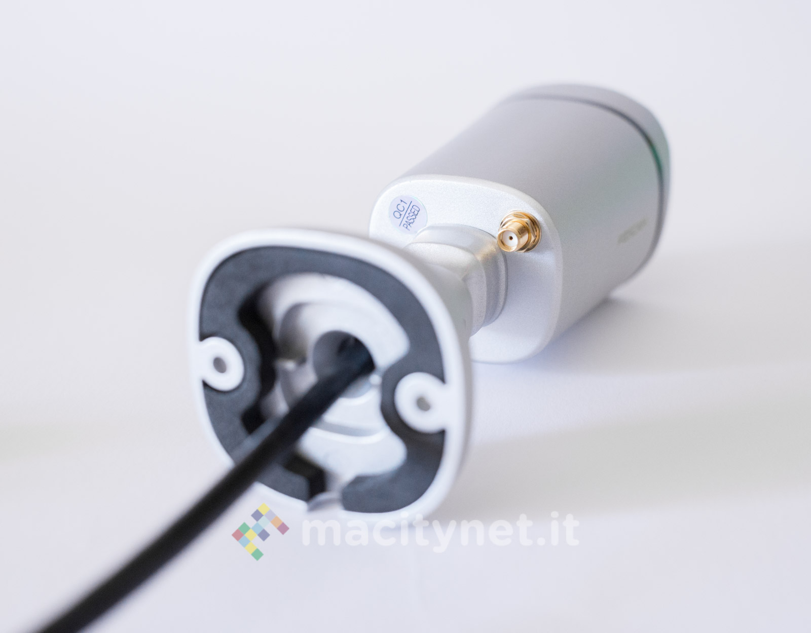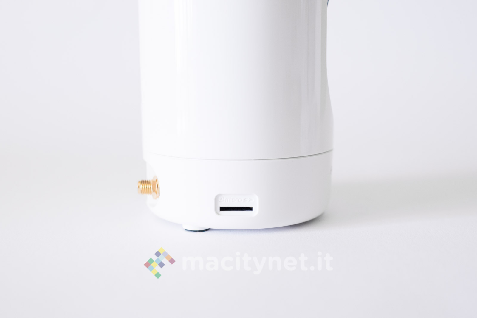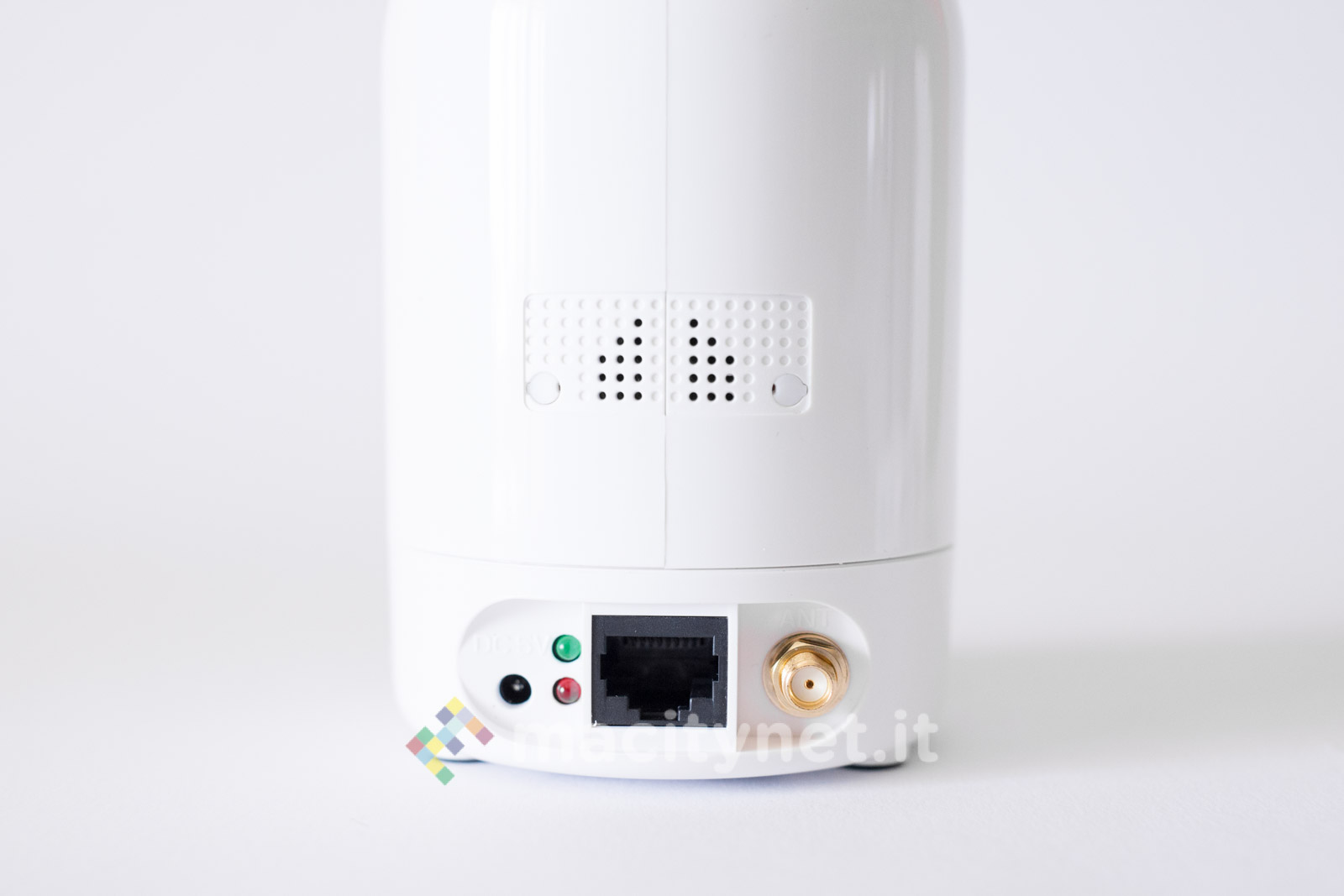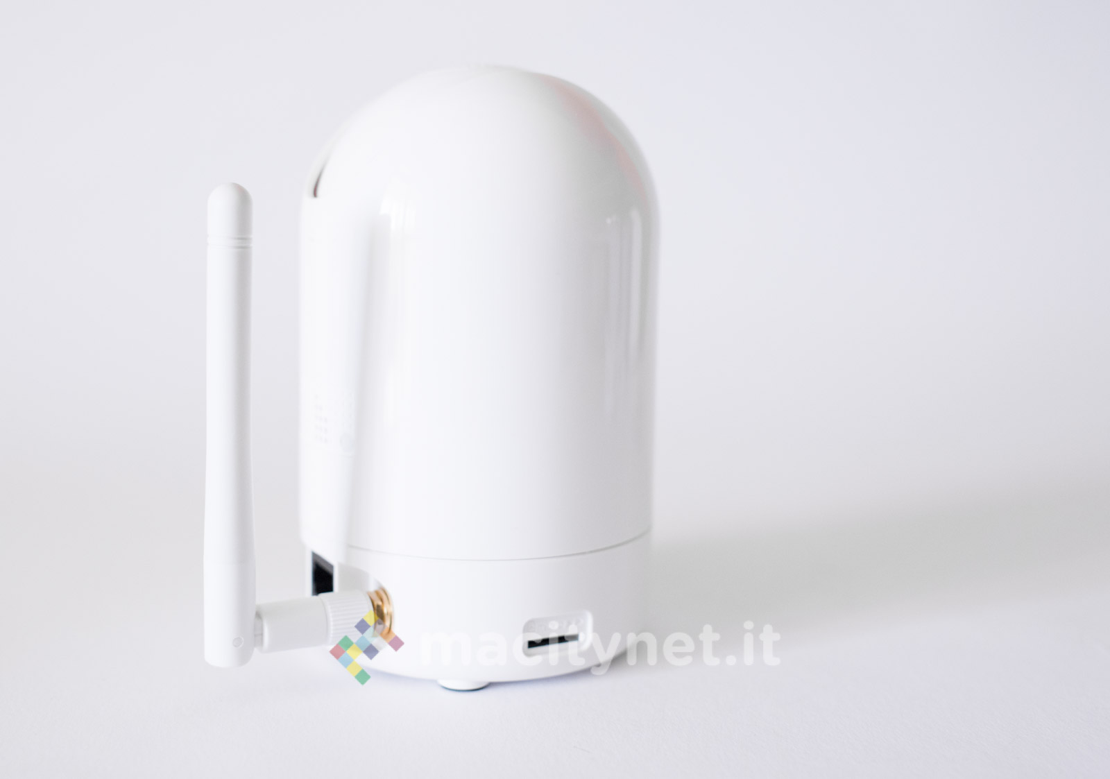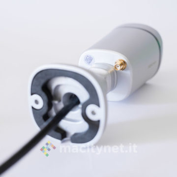 Si collega alla rete di casa tramite WiFi (in tal caso c’è un’antenna da montare) oppure via cavo Ethernet. Si alimenta attraverso un caricatore incluso in confezione ed è necessario acquistare separatamente una microSD per l’archiviazione delle registrazioni.