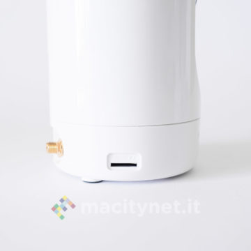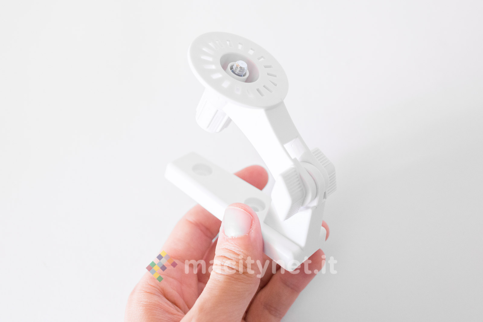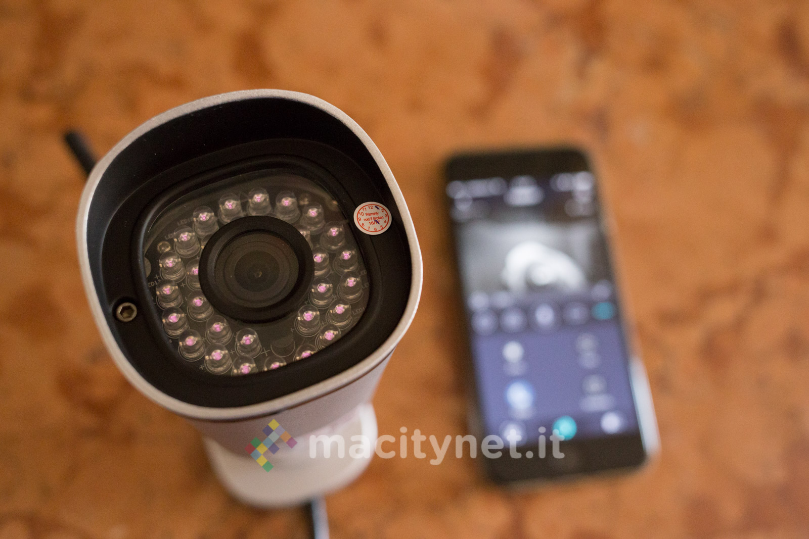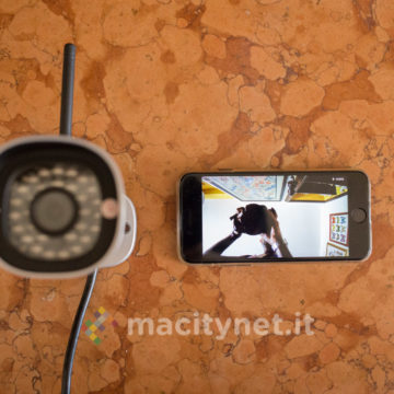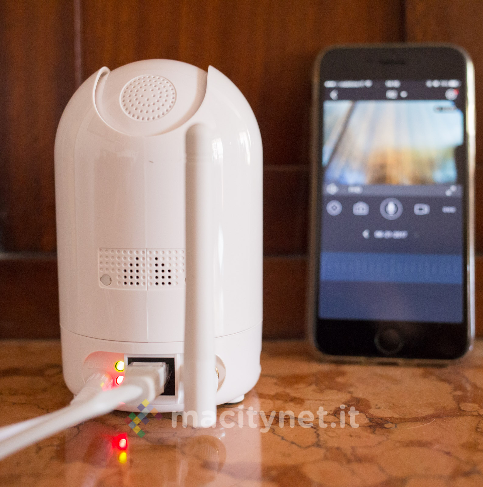 Si collega alla rete di casa tramite WiFi (in tal caso c’è un’antenna da montare) oppure via cavo Ethernet. Si alimenta attraverso un caricatore incluso in confezione ed è necessario acquistare separatamente una microSD per l’archiviazione delle registrazioni.