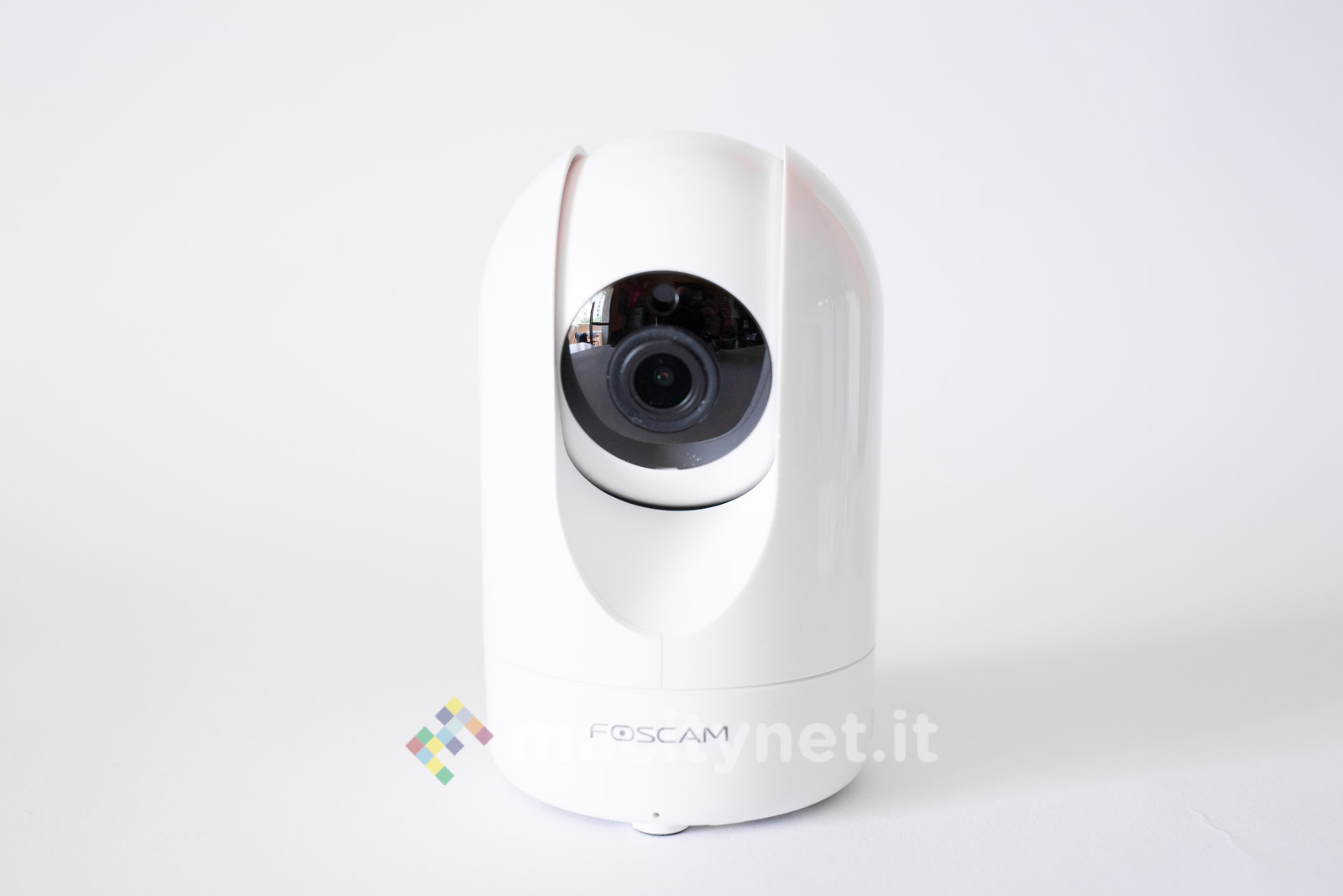 Delle due, R2 è la più piccola ed è progettata per l’utilizzo in ambienti interni. Non è infatti impermeabile e le linee sono molto morbide, inoltre non si è obbligati ad appenderla al muro ma si può anche semplicemente appoggiare su una superficie piatta come potrebbe essere un tavolo al centro del salotto o una mensola vicino ad alcuni libri. La colorazione bianca della plastica che costituisce lo chassis della telecamera ben si accosta ad un arredamento moderno e la forma appare molto “familiare”: sarà per il nome R2 che richiama quello di R2-D2, il robot di Guerre Stellari con il quale – con un po’ di fantasia – si possono trovare alcune leggere somiglianze.