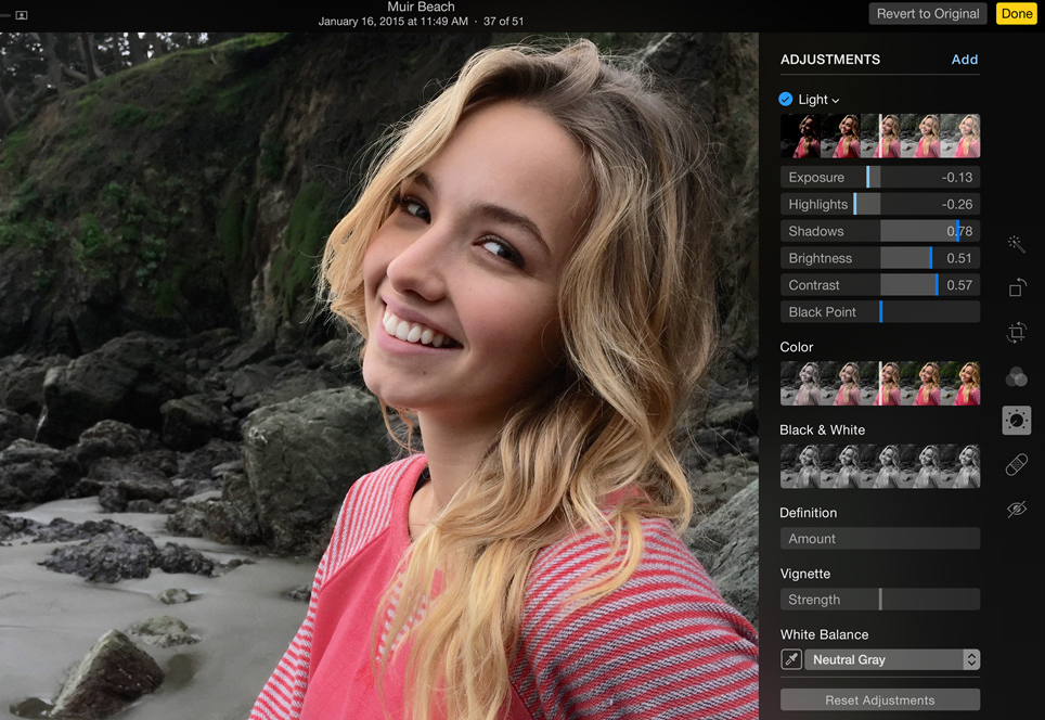 Per ciascuna foto, come già sopra accennato, potranno essere adoperati una serie di strumenti per l’editing, semplici e completi allo stesso tempo. Con un semplice tocco sul pulsante “Migliora”, l’immagine sarà automaticamente ottimizzata, mentre svariati cursori smart potranno essere adoperati per regolare l’illuminazione o il colore. Questi slider utilizzano algoritmi in grado di analizzare l’immagine e applicare il giusto mix di personalizzazioni. È anche possibile gestire manualmente alcuni parametri, ridurre eventuale rumore, modificare la luce, l’esposizione, le ombre, il contrasto, e altro ancora. Si potrà anche giocare con i colori, trasformando uno scatto in una foto in bianco e nero, aggiungendo un effetto vignetta con sfumatura ai bordi, decidere se aumentare la nitidezza dell’immagine. Insomma, Foto per OS X non sarà semplicemente una libreria fotografica, ma anche un pratico strumento per modificare le proprio foto. Inoltre, dopo aver effettuato una modifica, è possibile confrontare rapidamente il risultato allo scatto originale, semplicemente premendo il tasto M sulla tastiera. Non mancano i classici filtri, grazie ai quali sarà sufficiente un solo click per cambiare completamente stile alla foto; otto quelli disponibili: Mono, Tonal, Noir, Fade, Chrome, Process, Transfer e Instant.