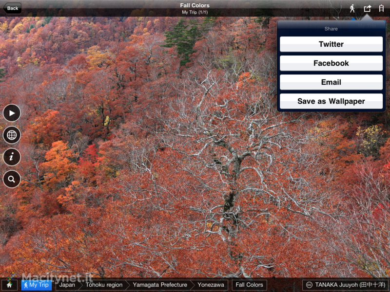 Con un tap possiamo immergerci nei paesaggi surreali e nell’affascinante cultura del Giappone visualizzando oltre 1.000 fotografie di qualità elevata, a pieno schermo su iPhone e iPad. Per una esperienza di navigazione migliore è consigliabile usare il tablet della Mela e disporre di un collegamento a Internet via Wi-Fi per il download delle immagini. Le foto mostrano numerose tra le località più interessanti del Paese per panorama e natura ma anche scorci sui principali edifici e templi, offrendo all’utente uno sguardo incantevole sull’architettura, la cultura e le tradizioni millenarie del Giappone. Tenendo premuto il dito sullo schermo possiamo accedere ai menu principali che permettono di visualizzare informazioni e dati sulla località o l’edificio mostrato, inserire la tappa nel nostro itinerario di viaggio per programmare la visita in Giappone. Tra le altre funzioni più interessanti ricordiamo la possibilità di condividere le notevoli fotografie con i contatti di Facebook, Twitter, in mail oppure di salvare le foto per utilizzarle come wallpaper.