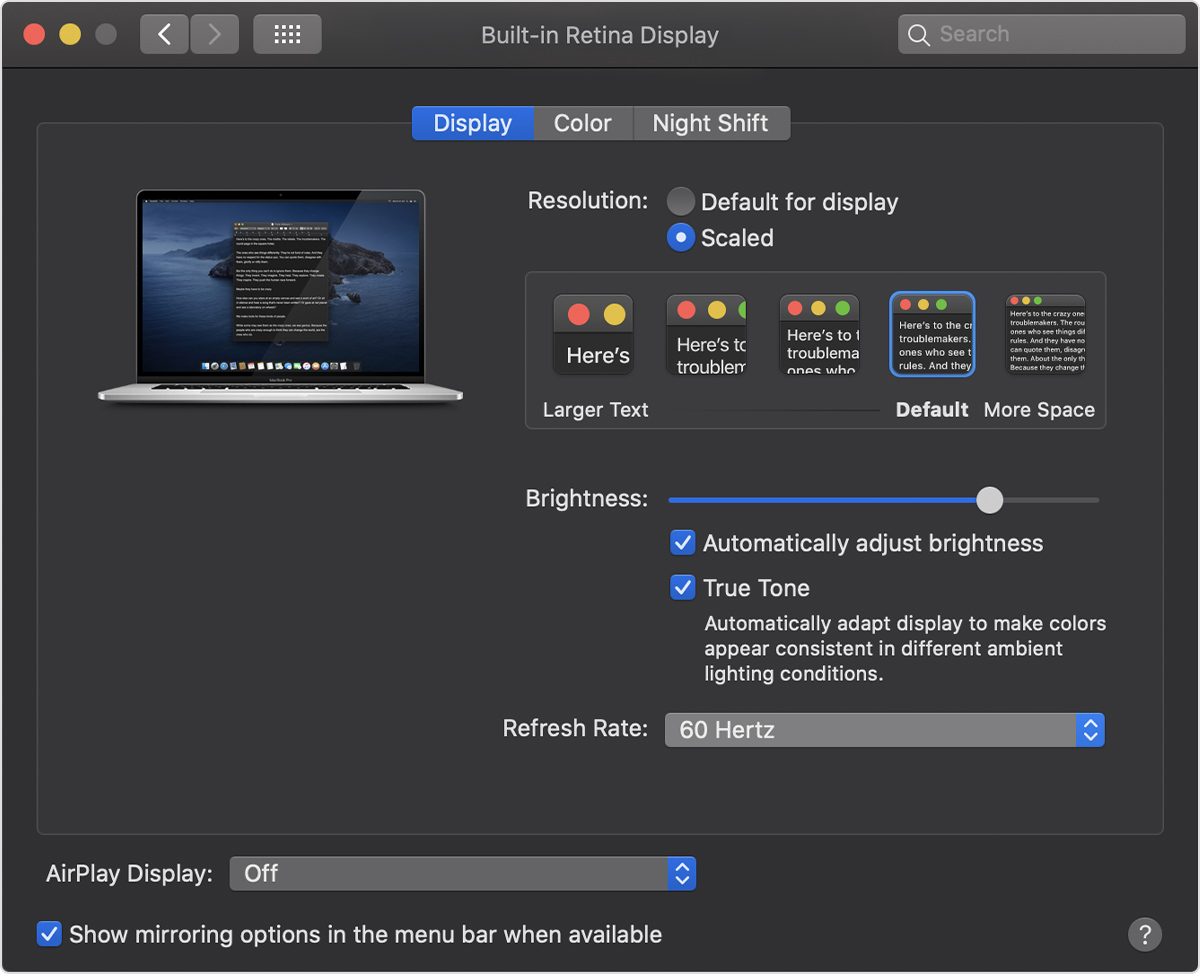 Tra le peculiarità del MacBook Pro 16 pollici, la possibilità di cambiare la frequenza di aggiornamento dello schermo, in inglese refresh rate o frequenza verticale relativa al numero di volte in un secondo in cui viene ridisegnata l’immagine sullo schermo. Questa funzionalità è particolarmente utile con alcuni flussi di lavoro nell’ambito del video editing.