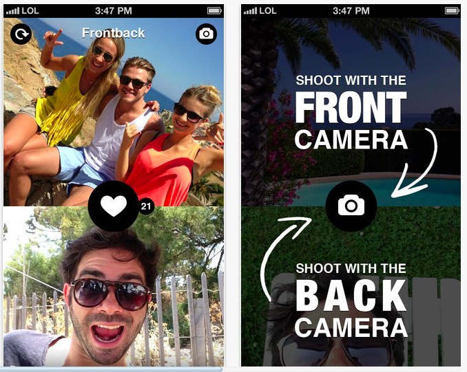 Frontback è un’interessante applicazione per iOS che tenta di aggiungere un nuova prospettiva alle immagini scattate con il proprio iPhone. Con l’applicazione sarà possibile scattare un’immagine di un soggetto, scattare una seconda fotografia con la fotocamera frontale (di solito l’immagine di chi ha scattato la prima fotografia) e combinarle in un unico risultato da condividere poi con gli amici.