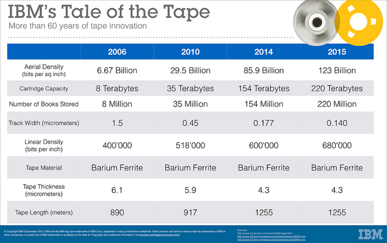 IBM vanta una lunga tradizione di innovazione nella memorizzazione di dati su nastro magnetico. Il suo primo nastro commerciale, il 726 Magnetic Tape Unit, risale a più di 60 anni fa. Questo tipo di nastro utilizzava bobine con una larghezza del nastro di mezzo pollice ciascuna, ed una capacità di circa 2 megabyte. La dimostrazione della densità areale presentata oggi può far raggiungere un potenziale aumento nella capacità pari a 110.000.000 di volte rispetto al primo nastro.