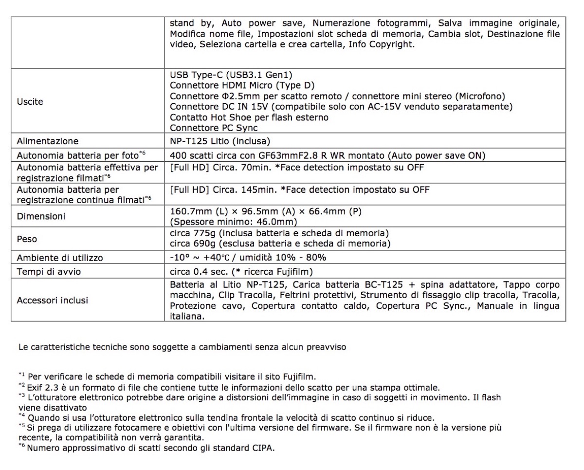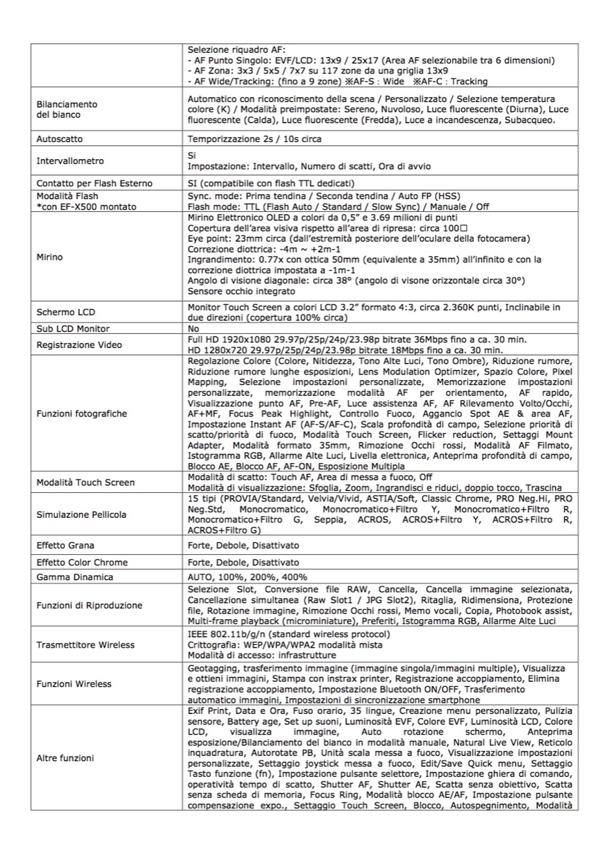 Tra le caratteristiche tecniche segnaliamo la presenza di un mirino elettronico (EVF) di tipo “organic EL” da 0,77x e 3,69M di pixel, motore di elaborazione d’immagine X-Processor Pro e joystick di Messa a Fuoco che garantisce una migliore presa della macchina grazie all’eliminazione dei classici pulsanti di selezione.