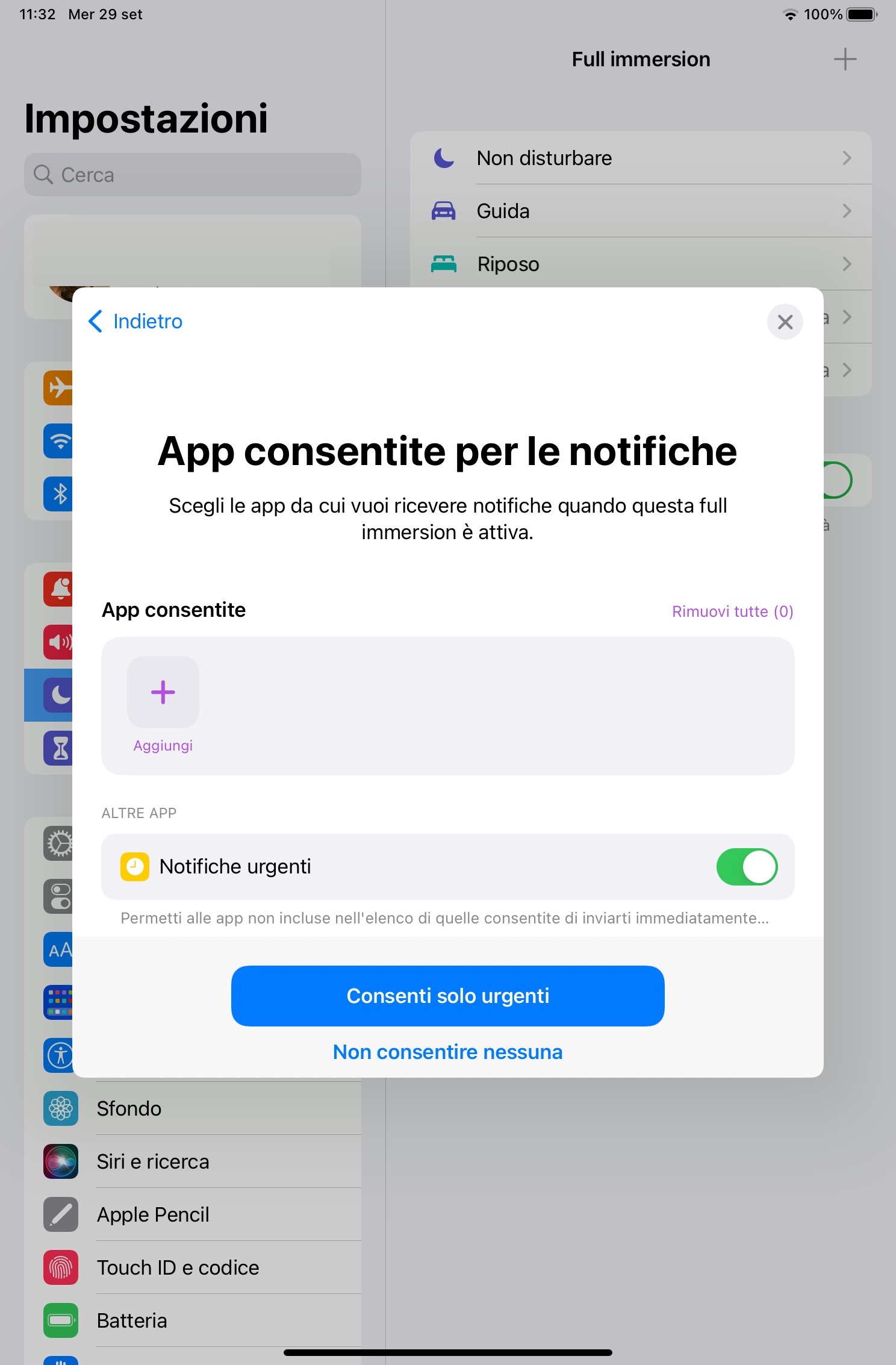 Quando si configura una modalità di full immersion, si potranno abilitare le notifiche urgenti dalle app, in modo che le app non incluse nell’elenco di quelle consentite possano comunque inviare notifiche contrassegnate come Notifiche urgenti.