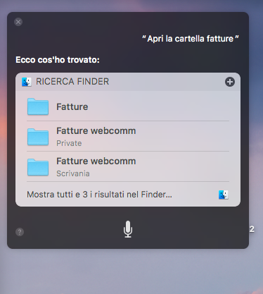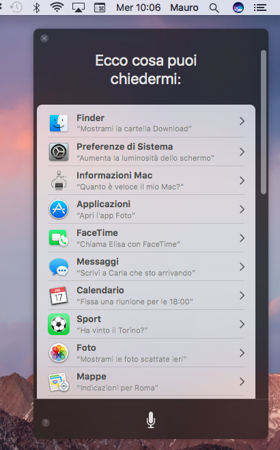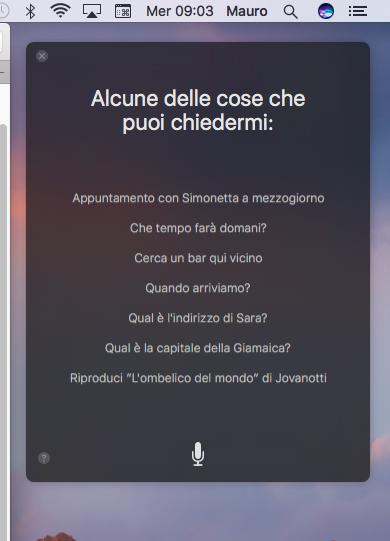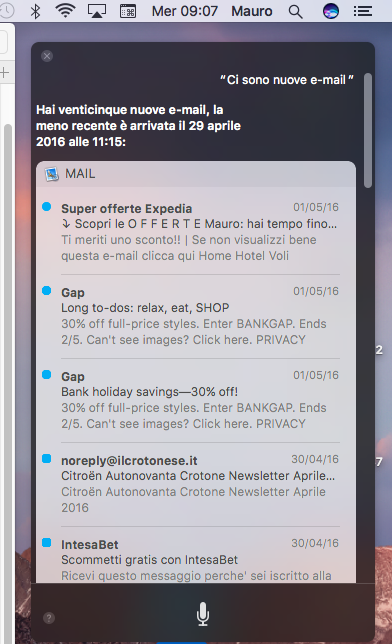 Oltre a queste cose, Siri può svolgere compiti specifici del Mac con comandi del tipo “Cerca la cartella Fatture”, “Cerca i documenti creati martedì”, “Ci sono nuove mail?”, “Quali sono i miei appuntamenti oggi”, “Mostrami i promemoria”.