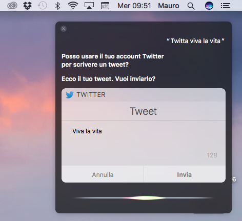 Non manca ovviamente la possibilità di pubblicare post su Facebook e tweet su Twitter. La prima volta che si specificano richieste di questo tipo viene richiesta conferma all’uso dell’account Facebook/Twitter. Prima dell’invio vero e proprio è possibile confermare o annullare. Se non l’avete ancora fatto, impostate gli account social nel sistema operativo: basta andare in Preferenze di Sistema > Account Internet e aggiungere account Twitter, Facebook e altri ancora. Gli account in questione possono esser sfruttati da più applicazioni (Mail, Contatti, Calendario, Messaggi e altre app) semplificando l’integrazione con il sistema.