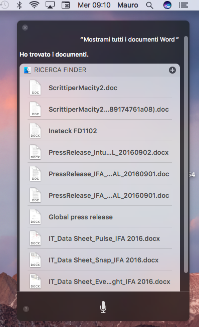 È anche possibile eseguire ricerche del tipo: “Mostrami tutti i documenti Word”, “Mostrami tutti i documenti Pages”, “Qual è l’indirizzo di xxx?”